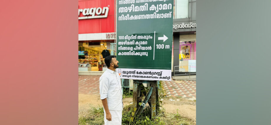 നിങ്ങൾ പിണറായിയുടെ അഴിമതിക്യാമറ നിരീക്ഷണത്തിലാണ്. 100 മീറ്ററിന് അപ്പുറം അഴിമതിക്യാമറ നിങ്ങളെ പിഴിയാൻ കാത്തിരിക്കുന്നു’, എന്നാണ് ബോർഡിൽ വ്യക്തമാക്കിയിട്ടുള്ളത്. അതേസമയം, എ ഐ ക്യാമറക്കെതിരെ പ്രതിഷേധം കടുപ്പിച്ചിരിക്കുകയാണ് പ്രതിപക്ഷം.