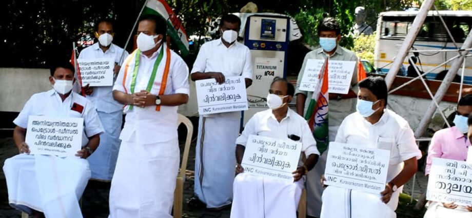 തിരുവനന്തപുരം മാനവീയം വീഥിക്ക് സമീപത്തെ പെട്രോൾ പമ്പിന് മുന്നിലായിരുന്നു കോൺഗ്രസ് പ്രതിഷേധം സംഘടിപ്പിച്ചത്. കൊറോണക്കാലത്ത് പെട്രോൾ വില സെഞ്ച്വറി കടക്കുമ്പോഴും ജനങ്ങളുടെ ബുദ്ധിമുട്ട് കണ്ടില്ലെന്നു നടിക്കുകയാണ് മോദി സർക്കാർ. പെട്രോൾ, ഡീസൽ വിലവർധനവ് കാരണം സാധാരണ ജനങ്ങളാണ് പ്രതിസന്ധിയിലാകുന്നത്. കേന്ദ്രം നികുതി കൂട്ടിയാൽ ലാഭം കിട്ടുമെന്ന നിലപാടാണ് സംസ്ഥാന സർക്കാരിന്റേത്. പെട്രോളിന്റെയും ഡീസലിന്റെയും വില വർധിക്കുമ്പോൾ കേരളത്തിന്റെ ഭരണകൂടം ആഹ്ലാദിക്കുകയാണ്. ബിജെപിയുടെ നയങ്ങൾക്ക് ഇടത് സർക്കാർ ഒത്താശ ചെയ്യുകയാണ്. കേന്ദ്ര-സംസ്ഥാന സർക്കാരുകളുടെ നിലപാട് സാധാരണ ജനങ്ങളെ ബുദ്ധിമുട്ടിക്കുന്നുവെന്നും ജനങ്ങൾക്ക് രാജ്യത്ത് ജീവിക്കാൻ കഴിയാത്ത അവസ്ഥയാണെന്നും രമേശ് ചെന്നിത്തല വ്യക്തമാക്കി.
