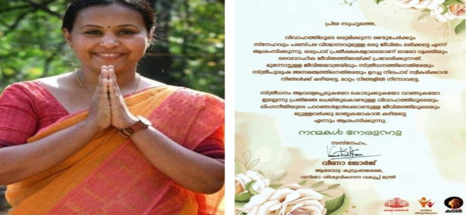 മാത്രമല്ല, സ്ത്രീധനത്തിനെതിരായ പ്രചരണ പരിപാടികള്ക്ക് കൂടുതല് ഊര്ജ്ജം പകരുന്നതായിരുന്നു ഗവര്ണറുടെ വാക്കുകളെന്നും, അദ്ദേഹത്തിന്റെ നല്ല വാക്കുകള്ക്ക് നന്ദി രേഖപ്പെടുത്തുന്നു, വധൂവരന്മാര്ക്ക് മംഗളാശംസ നേരുന്നതിന് ഒപ്പം സ്ത്രീധനത്തിനെതിരായ സന്ദേശവും വിവാഹ ജീവിതത്തില് സ്ത്രീയ്ക്കും പുരുഷനുമുള്ള പങ്കും ഓര്മ്മിപ്പിക്കുന്നതിനുമാണ് വനിതാ ശിശുവികസന മന്ത്രി എന്ന നിലയില് കാര്ഡ് അയക്കുന്ന പദ്ധതി ആരംഭിച്ചതെന്നും മന്ത്രി വ്യക്തമാക്കി.
