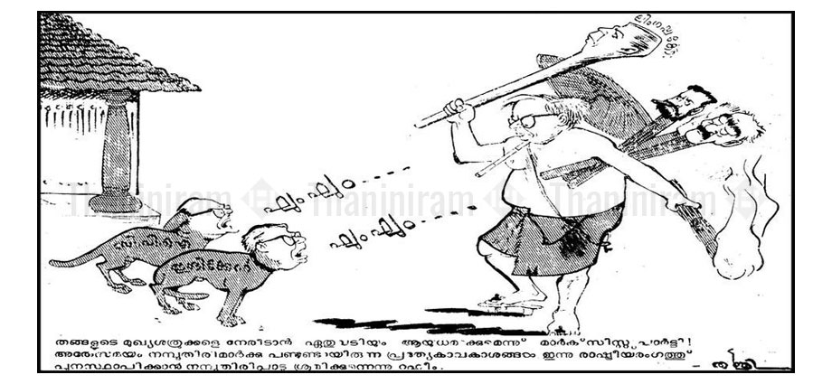 കേരളത്തിലെ നമ്പൂതിമാരുടെ യഥാർത്ഥ സ്വഭാവം. ചൂട്ടും കെട്ടി രാത്രി നടന്നു പോകുന്ന നമ്പൂതിയെ പട്ടി ആക്രമിക്കാൻ വരുന്നു. സി പി അയി യും ഇന്ദിരാ കോൺഗ്രസ്സും ആണ് പട്ടികൾ. അന്ന് നിജലിംഗപ്പ കോൺഗ്രസ്സും വെല്ലിഗടനും മത്തായി മഞ്ഞൂരാനും കൂടെ ഉണ്ട്. ആ വടികളെ കൊണ്ട് പട്ടികളെ ഇ.എം.എസ് അടിക്കുന്നു.