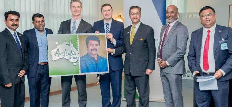 ആസ്ട്രേലിയയിലെ ഇന്ത്യൻ ഹൈക്കമ്മീഷണർ മൻപ്രീത് വോറയ്ക്കു ആദ്യ സ്റ്റാമ്പ് കൈമാറി പ്രധാനമന്ത്രി ആന്റണി ആൽബനീസിയുടെ പ്രതിനിധിയും പാർലമെന്ററി ഫ്രണ്ട്സ് ഓഫ് ഇന്ത്യയുടെ ചെയർമാൻ ഡോ ആൻഡ്രൂ ചാൾട്ടൻ എംപി പ്രകാശനം ചെയ്തു. ചടങ്ങിന് ആശംസകളറിയിച്ചികൊണ്ടുള്ള പ്രധാനമന്ത്രിയുടെ സന്ദേശം ആൻഡ്രൂ ചാൾട്ടൻ വായിച്ചു. ഇന്ത്യൻ സാംസ്കാരികതയുടെ മുഖമായി തങ്ങൾ മമ്മൂട്ടിയെ കാണുന്നുവെന്ന് ഡോ. ആൻഡ്രൂ ചാൾട്ടൻ എംപി പറഞ്ഞു. മമ്മൂട്ടിയെ ആദരിക്കുക വഴി ഇന്ത്യയുടെ മഹത്തായ സാംസ്കാരികതയെ ആണ് തങ്ങൾ ആദരിക്കുന്നതെന്ന് അദ്ദേഹം വ്യക്തമാക്കി.
