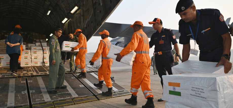 പലസ്തീനിലെ ജനങ്ങൾക്കായി 6.5 ടൺ മെഡിക്കൽ സഹായവും 32 ടൺ ദുരന്ത നിവാരണ സാമഗ്രികളുമായി വ്യോമസേനയുടെ സി-17 ഗ്ലോബ്മാസ്റ്റർ വിമാനം ഈജിപ്തിലെ അൽഹരീഷ് വിമാനത്താവളത്തിലേക്ക് പുറപ്പെട്ടതായി വിദേശകാര്യ മന്ത്രാലയ വക്താവ് അരിന്ദം ബാഗ്ചി അറിയിച്ചു. എക്സ് പ്ലാറ്റ്ഫോമിലൂടെയാണ് അദ്ദേഹം ഇക്കാര്യം അറിയിച്ചത്.