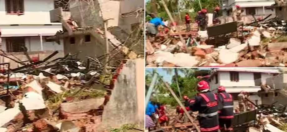 സ്ഫോടനം ഉണ്ടായ സ്ഥലത്തിന് സമീപത്തെ 45 ഓളം വീടുകൾക്കും കേടുപാടുകളുണ്ടായി. ഒരു കിലോമീറ്റർ അകലെവരെ പൊട്ടിത്തറിയുടെ പ്രകമ്പനമുണ്ടായി. അരകിലോമീറ്റർ അകലെ വരെ കെട്ടിടാവശിഷ്ടങ്ങളെത്തി. പുതിയകാവ് ക്ഷേത്രോത്സവത്തിനായി കൊണ്ടുവന്ന പടക്കങ്ങളാണ് പൊട്ടിത്തെറിച്ചത്.