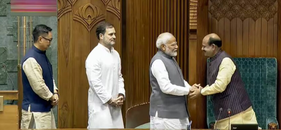 സ്പീക്കറായി തിരഞ്ഞെടുത്തതിന് പിന്നാലെ ഓം ബിർളയെ പ്രധാനമന്ത്രി നരേന്ദ്ര മോദിയും പ്രതിപക്ഷ നേതാവ് രാഹുൽ ഗാന്ധിയും ചേർന്ന് ഇരിപ്പിടത്തിലേക്ക് ആനയിച്ചു. മാവേലിക്കര എംപി കൊടിക്കുന്നിൽ സുരേഷായിരുന്നു. ഇന്ത്യ സഖ്യത്തിന്റെ സ്ഥാനാർഥി. ഓം ബിർളയെ തിരഞ്ഞെടുക്കാനുള്ള പ്രമേയം പ്രധാനമന്ത്രി നരേന്ദ്ര മോദിയാണ് അവതരിപ്പിച്ചത്.