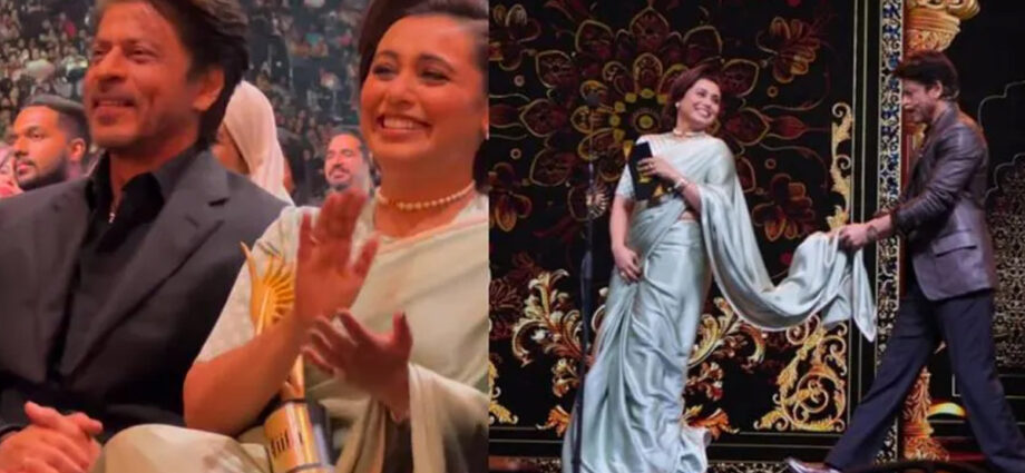 നടി റാണി മുഖർജി വീഴാതിരിക്കാൻ സാരിയുടെ മുന്താണി കൈയിൽപിടിച്ച് ബോളിവുഡ് താരം ഷാരൂഖ് ഖാൻ. റാണി മുഖർജി സാരിയിൽ ചവിട്ടി വീഴാതെ അവരെ സംരക്ഷിക്കുകയായിരുന്നു ബോളിവുഡിന്റെ സ്വന്തം കിംഗ് ഖാൻ. അബുദാബിയിൽ ഐഫ പുരസ്കാരച്ചടങ്ങിന്റെ വേദിയിലായിരുന്നു സംഭവം. ഈ പുരസ്കാരച്ചടങ്ങിന്റെ അവതാരകൻ കൂടിയായിരുന്ന ഷാരൂഖ്.